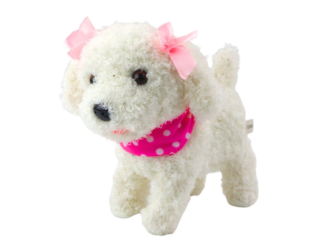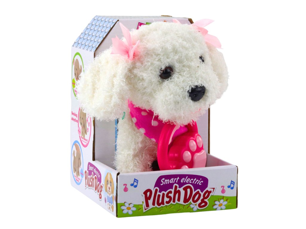 - Tento okouzlující bílý pejsek je vyroben z měkkého plyše, který vybízí k mazlení, a přináší realistický zážitek díky schopnosti chodit a štěkat