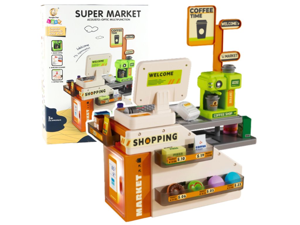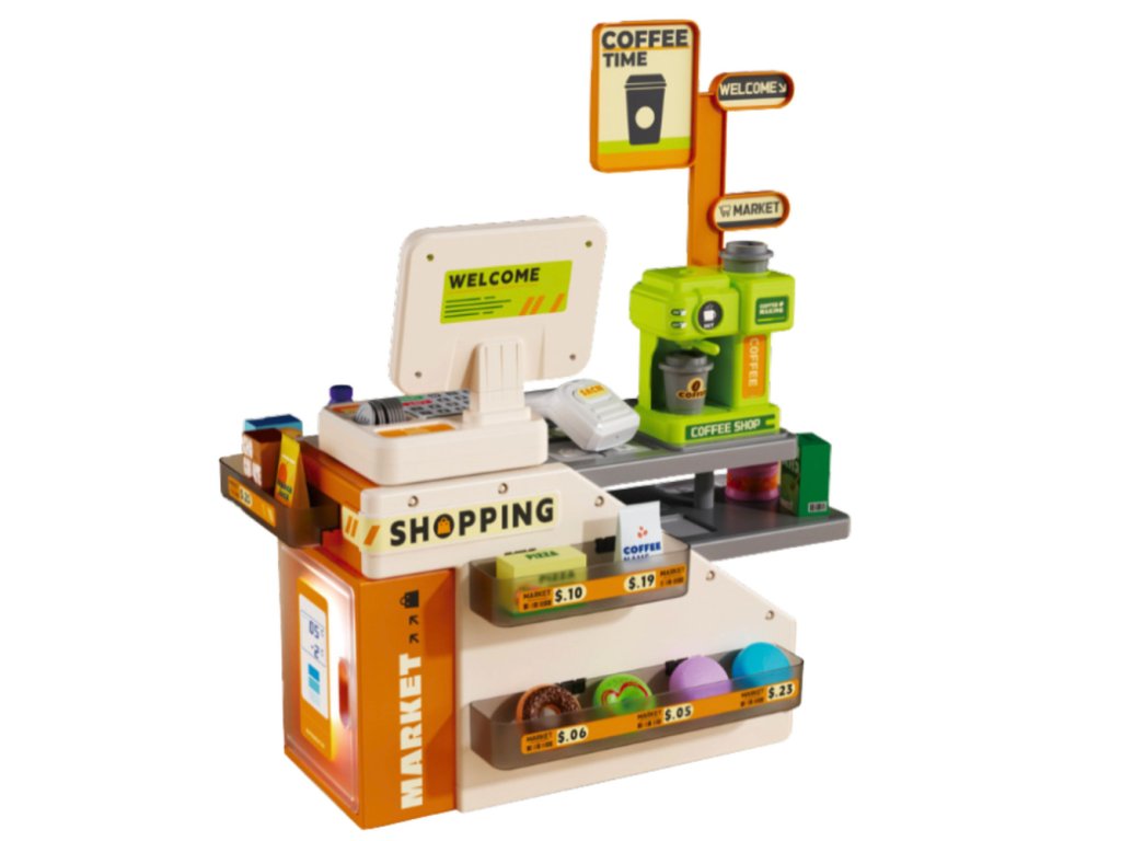 Součástí setu je otevírací pult a funkční lednička, kam mohou děti ukládat své hračkové produkty. Na pultě najdete také velký kávovar, který „připraví“ nápoj poté, co jej naplníte vodou a otočíte pákou. Káva stéká do šálku, což činí zábavu výjimečně realistickou a vzrušující.