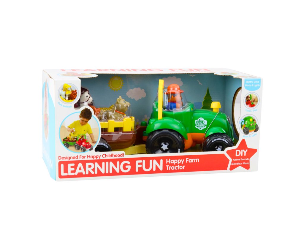 Hračka je vybavena třemi různými melodiemi a během jízdy blikají přední světla traktoru, což navíc přitahuje pozornost dítěte Traktor se pohybuje plynule a bez překážek táhne přívěs, na kterém jsou zvlášť označená místa pro figurky zvířátek