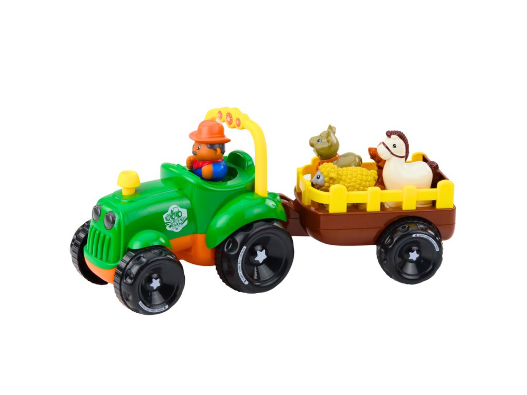 - Traktor se zvířátky pro děti s pohonem a přívěsem je interaktivní hračka, která spojuje zábavu s učením díky zvukovým, světelným a tvarovým prvkům