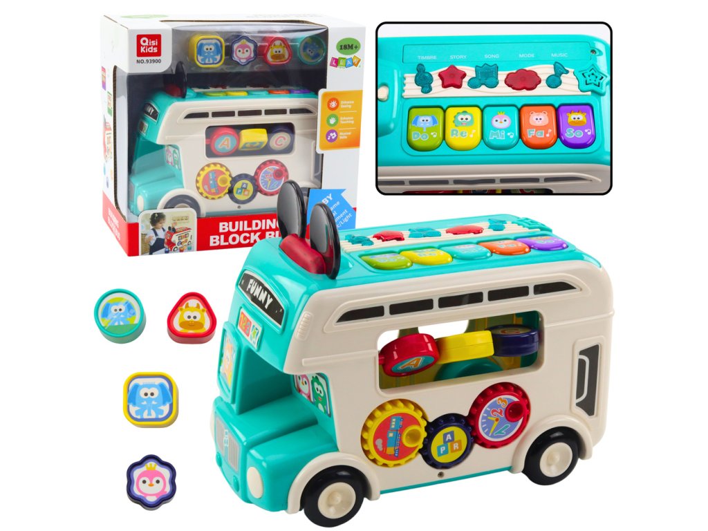 Díky živým barvám, zvukovým efektům a funkci třídění kostek, se děti angažují v kreativní hře a zároveň se učí základy abecedy, rozpoznávání tvarů a logického myšlení Autobus je vybaven otvory pro kostky s písmenky, které mohou děti přiřazovat na správná místa, čímž rozvíjí jejich pozorovací schopnosti a přesnost pohybů