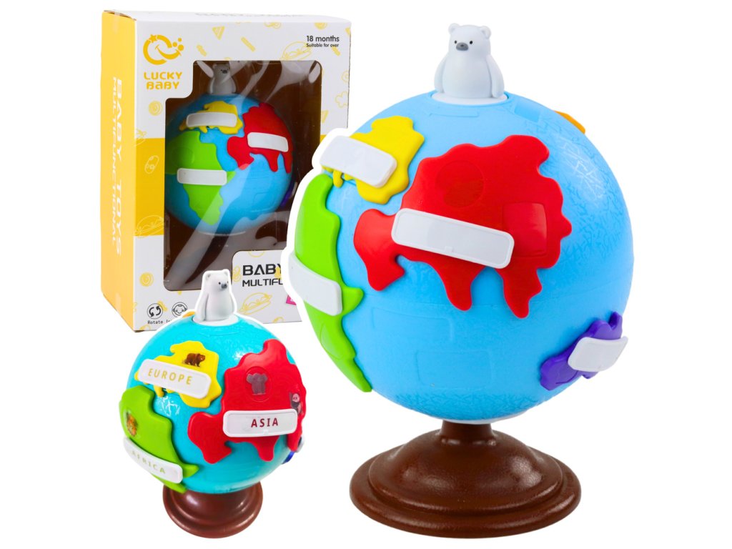 Interaktivní vzdělávací globus je multifunkční hračka, navržená pro nejmenší děti již od 18 měsíců věku Barevná zeměkoule s otočnými prvky a kontinentálními puzzly pomáhá rozvíjet kognitivní schopnosti, logické myšlení a koordinaci ruka-oko