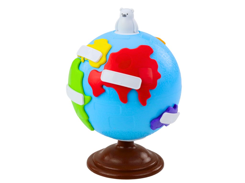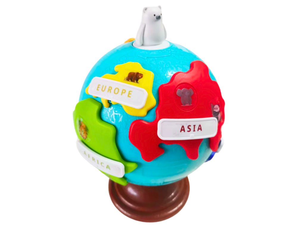 - Barevná zeměkoule s otočnými prvky a kontinentálními puzzly pomáhá rozvíjet kognitivní schopnosti, logické myšlení a koordinaci ruka-oko