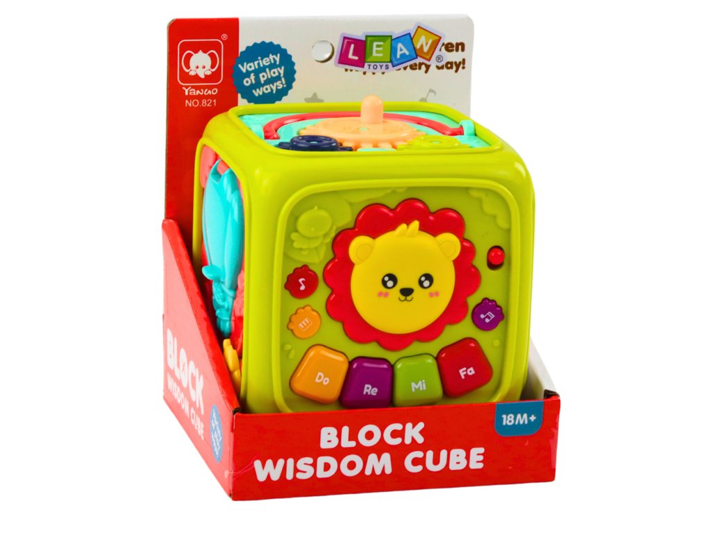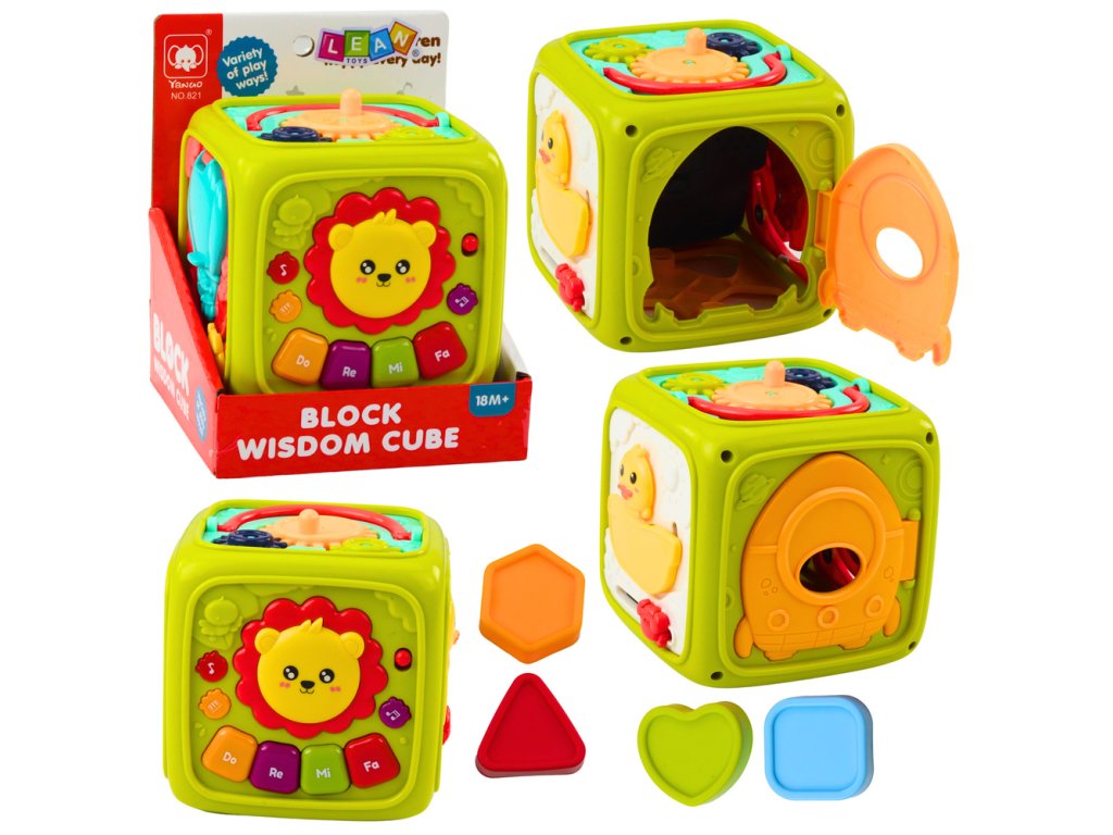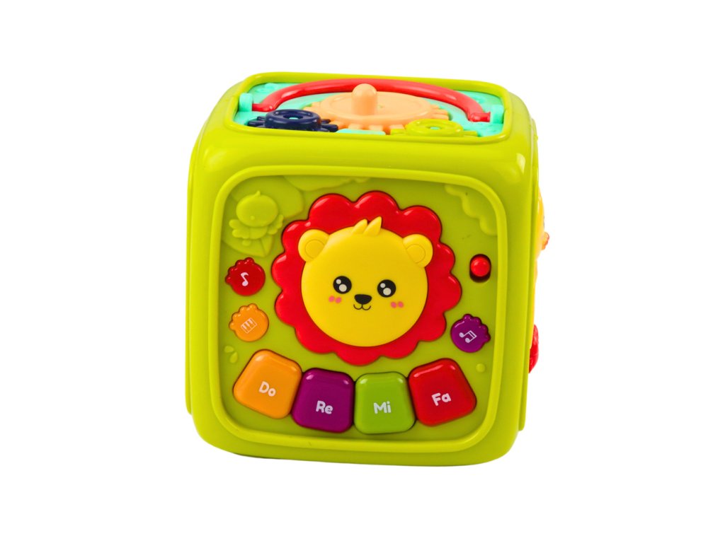 Interaktivní vzdělávací kostka pro děti Lev Zelená je barevná vzdělávací hračka určená pro nejmladší děti od 18 měsíců Každá strana této všestranné hračky nabízí jiný způsob hry, čímž rozvíjí motoriku, logické myšlení, koordinaci oko-ruka a poznávací schopnosti