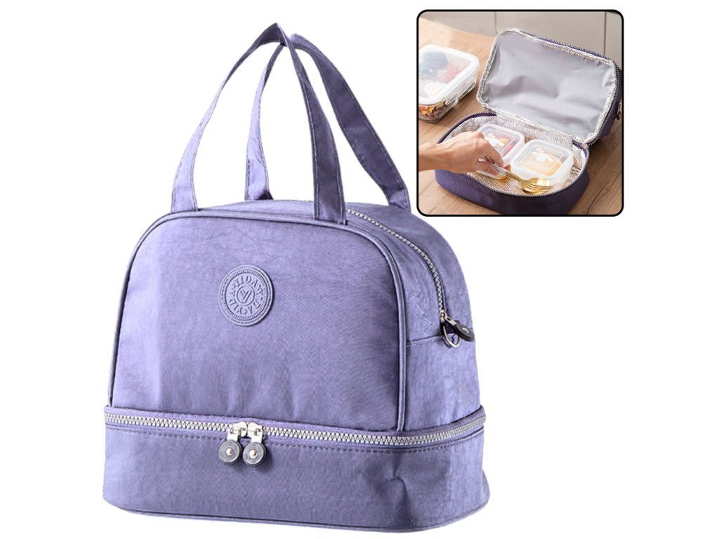 - Přenosná fialová izolační termotaška na obědy je funkční a stylové řešení pro aktivní osoby, které si cení pohodlí, čerstvosti a estetiky při uchovávání jídel za každých podmínek