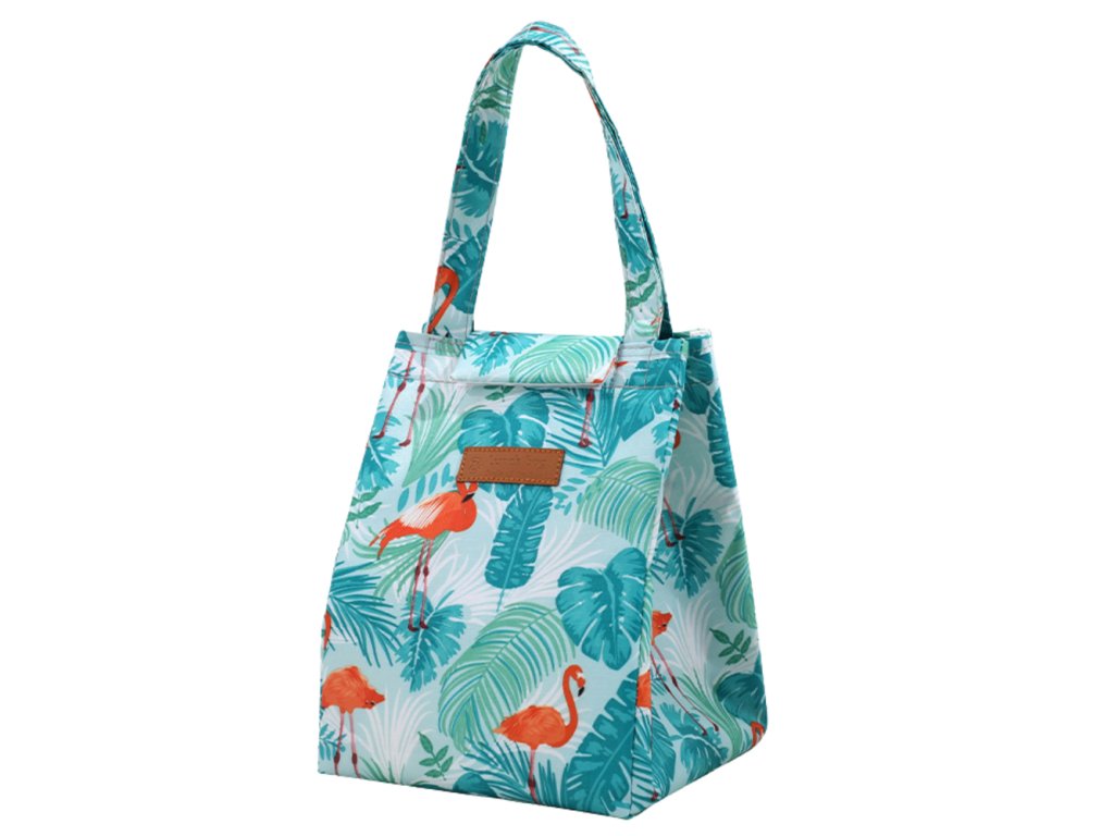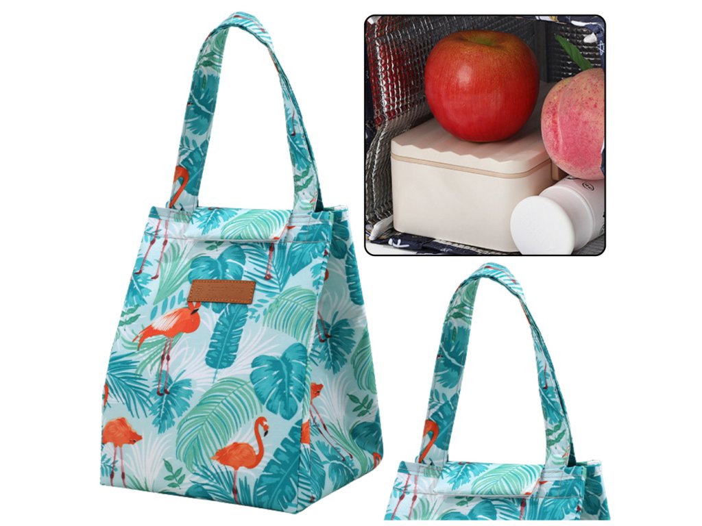 Prostorná a stylová izolační termotaška typu lunch bag je ideálním řešením pro každého, kdo chce nosit čerstvé jídlo do práce, školy nebo na piknik Její originální design s motivy tropických listů a plameňáků na světlém pozadí přitahuje pozornost a dodává jejímu vzhledu letní, pozitivní charakter