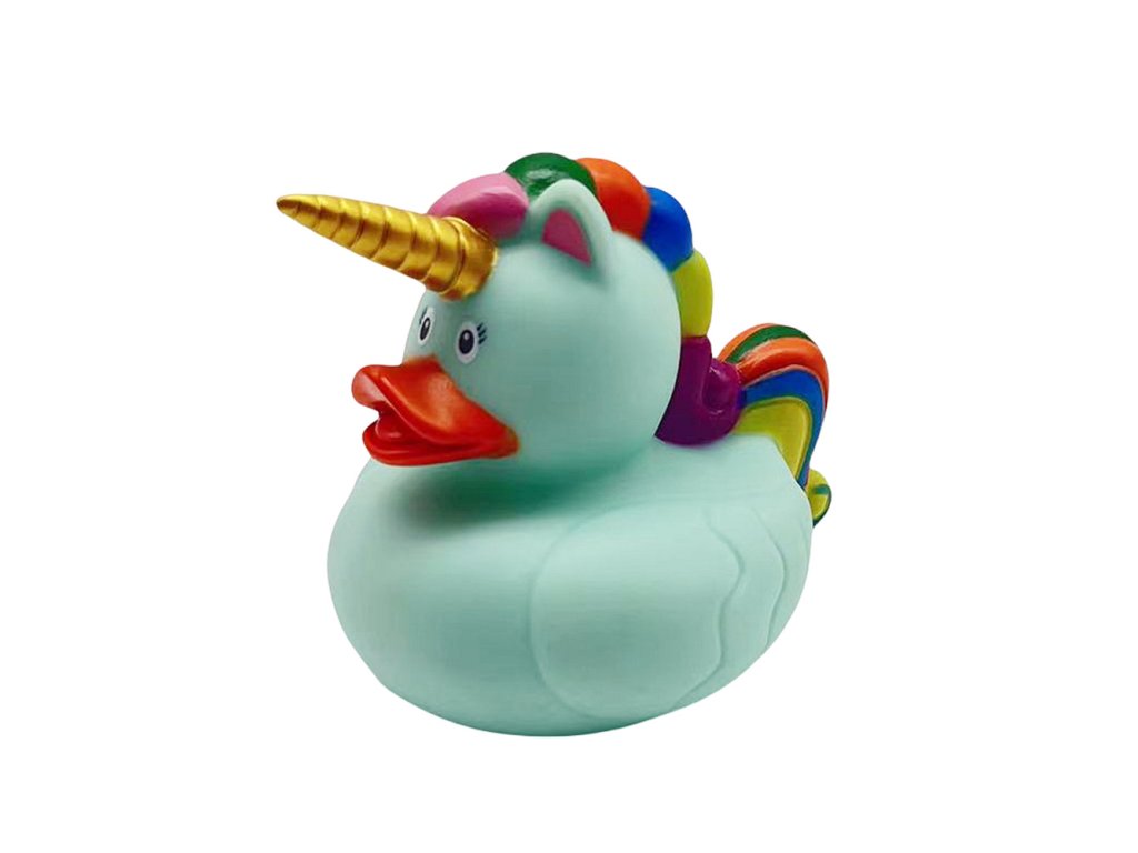 - Kachnička je v zelené barvě a má roh jednorožce, stejně jako duhovou hřívu a ocas, díky čemuž potěší každé dítě během koupele