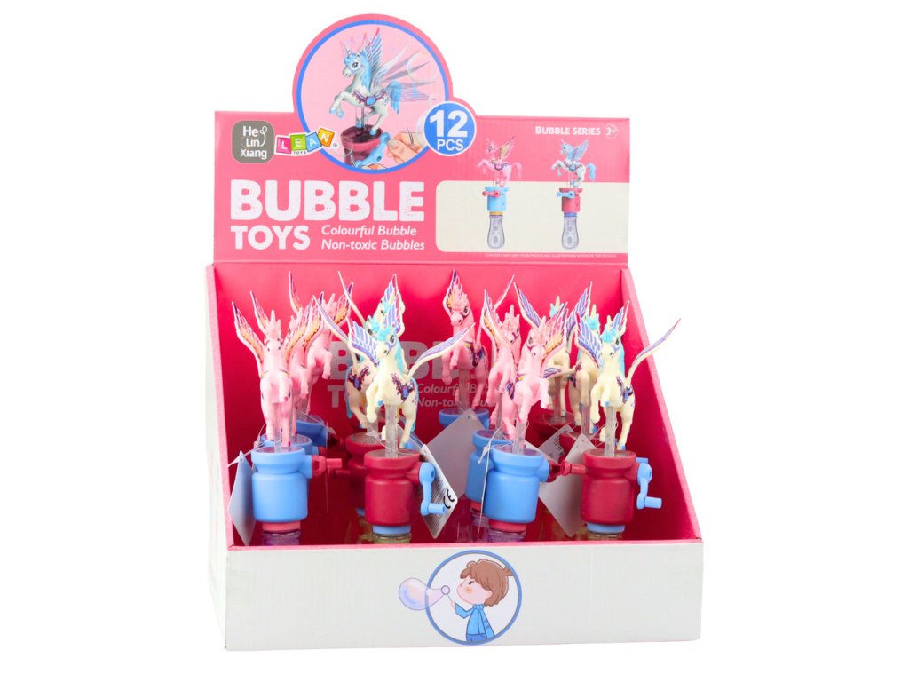 Tato výjimečná hračka o výšce 23 cm je vybavena mechanismem s klíčkem, díky němuž jednorožec po jeho otočení pohybuje křídly a vytváří dojem letu Sada obsahuje nádobku s kapalinou a růžku se dvěma otvory, což umožňuje vytvořit řadu barevných bublin