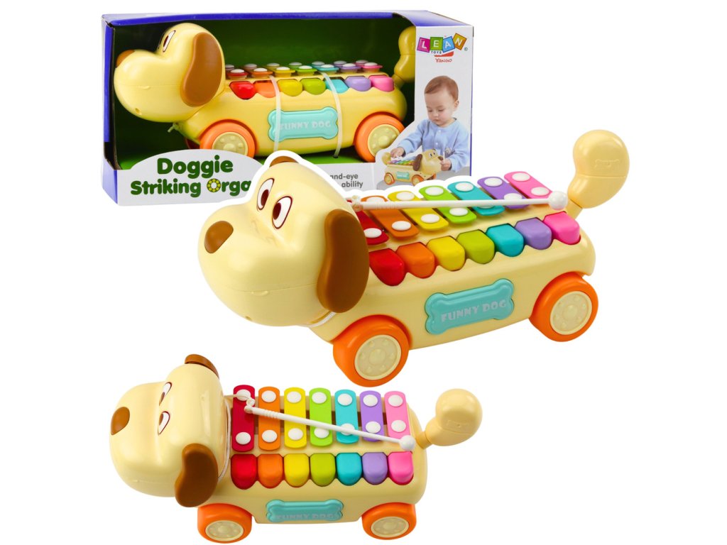 JEZDÍCÍ PEJSEK S XYLOFONEM A POHYBLIVÝMI ELEMENTY Jezdící pejsek s barevným xylofonem je roztomilá a funkční hudební hračka, která spojuje vzdělávací, pohybové a senzorické prvky Hračka vybízí děti k aktivní hře