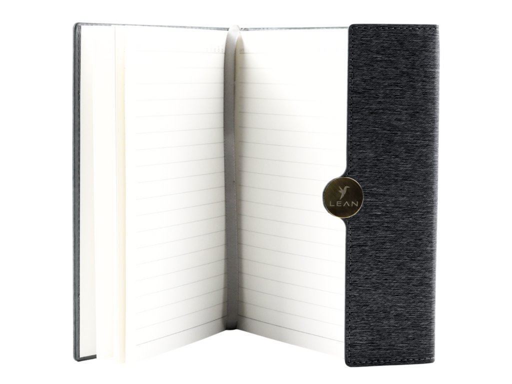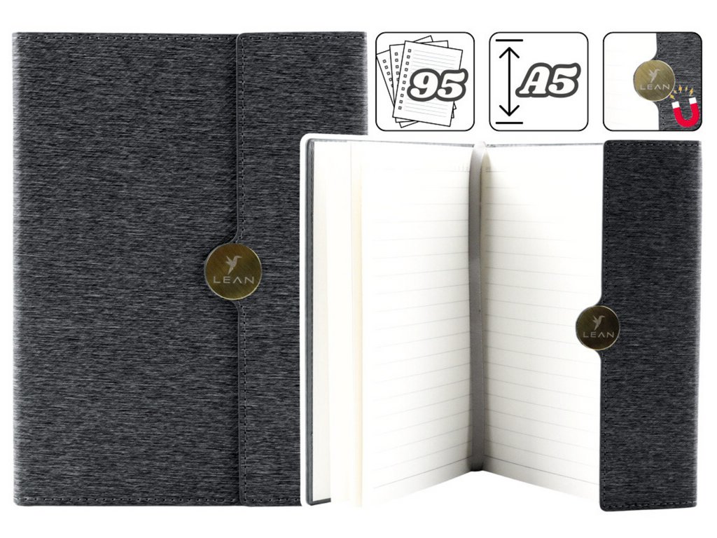 Kancelářský Magnetický Poznámkový Blok v Linkách A5 s Černým Potahem je elegantní řešení pro osobní i kancelářské využití Díky robustnímu zámku na magnet a vysoce kvalitnímu pevnému obalu chrání obsah před nechtěným otevřením a znečištěním