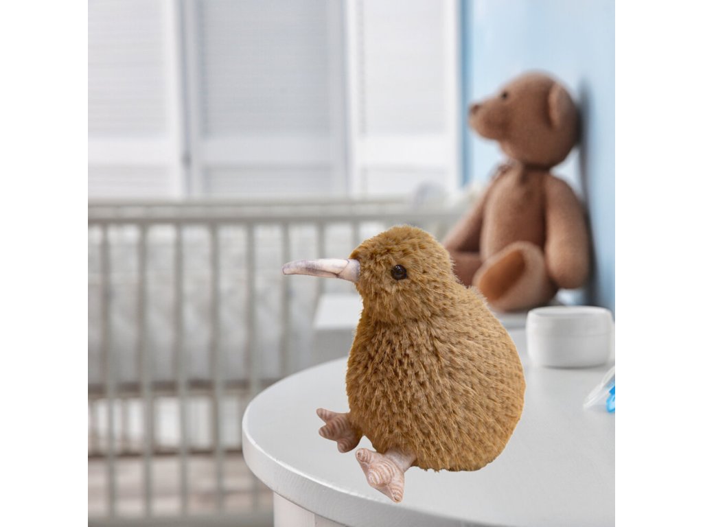 - Plyšová hračka znázorňující ptáka kiwi ve výšce 21 cm, věrně odrážející charakteristické světlehnědé opeření tohoto unikátního ptáka
