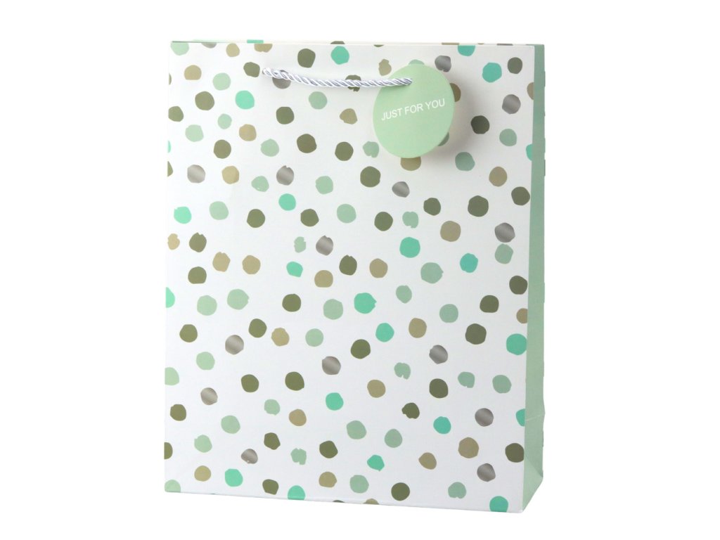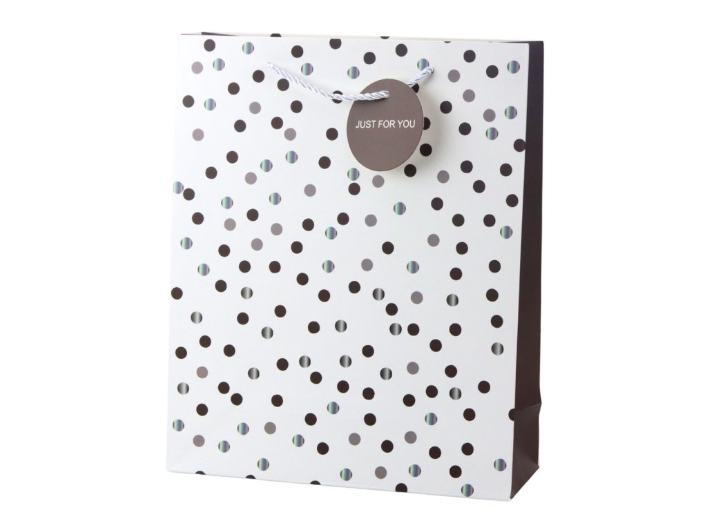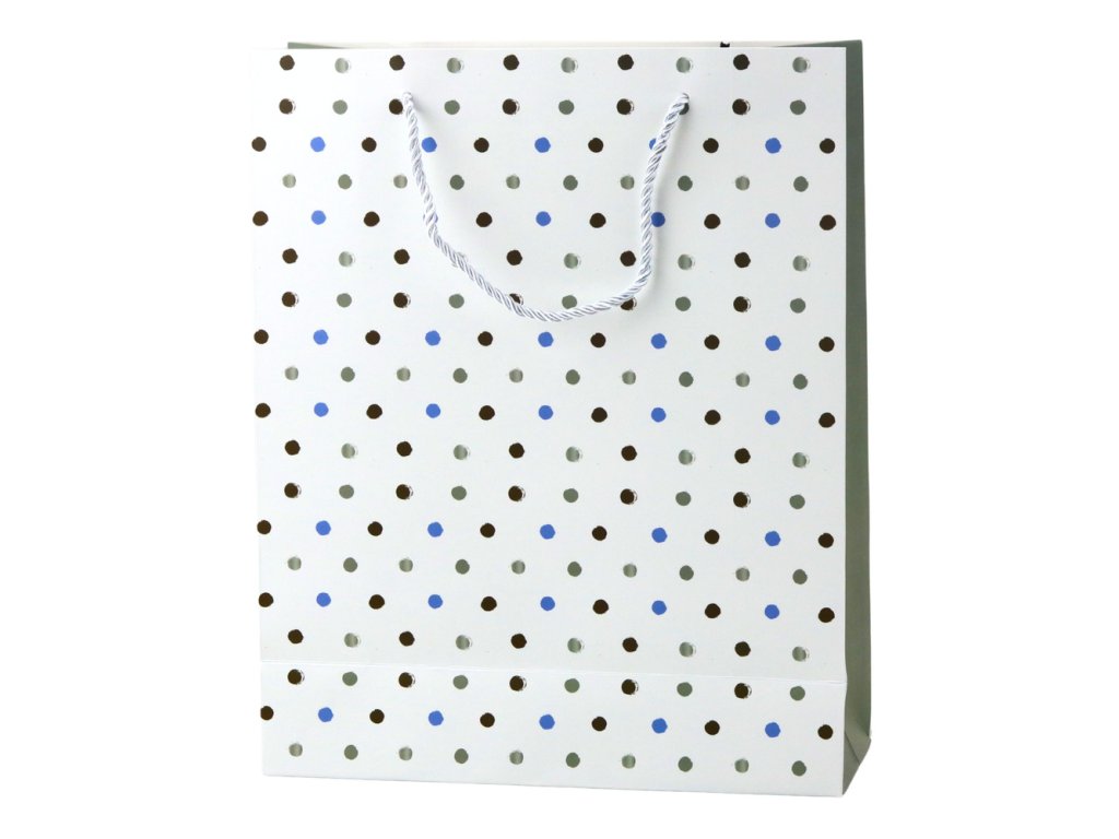 KLASICKÁ DÁRKOVÁ TAŠKA S PUNTÍKY Elegantní dárková taška s jemným vzorem puntíků je vynikajícím způsobem, jak esteticky zabalit dárek pro blízkou osobu.