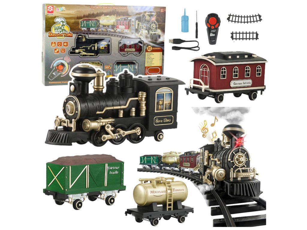 Představujeme vám elektrickou vláčkovou sadu Classical Train Series, skvělý dárek pro malé milovníky vláčků a interaktivních hraček. Tento set propojuje klasický design parních lokomotiv s moderními technologiemi a vytváří tak zábavu plnou realismu. Přidejte jednoduše vodu a vychutnejte si úžasný efekt páry stoupající z lokomotivy, který děti vtáhne do atmosféry dávné železniční dopravy. Díky světelným a zvukovým efektům je zážitek z jízdy jako z opravdového vlaku, a dálkové ovládání RC umožňuje plynulou regulaci rychlosti a směru jízdy.