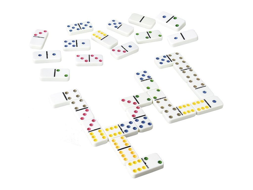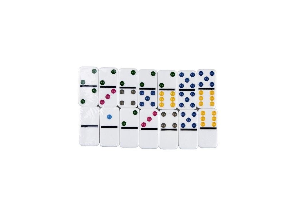 - Sada obsahuje 28 kamenů rozdělených na dvě čtvercová pole s barevnými tečkami, kde každá tečka značí bodovou hodnotu od 0 do 6