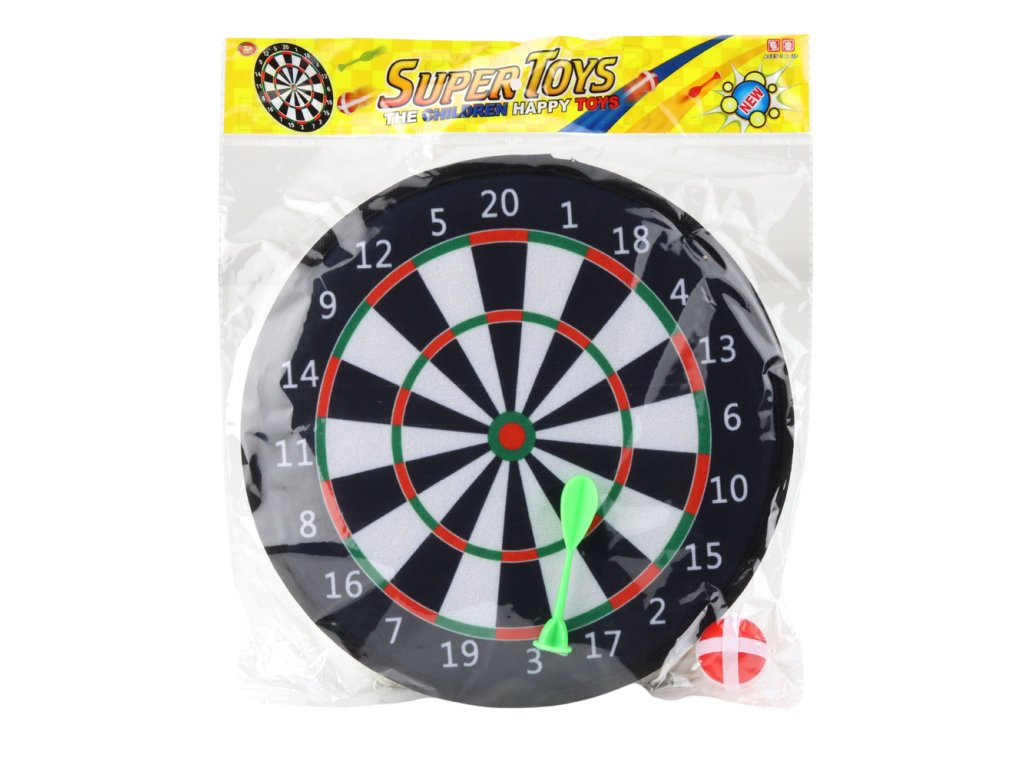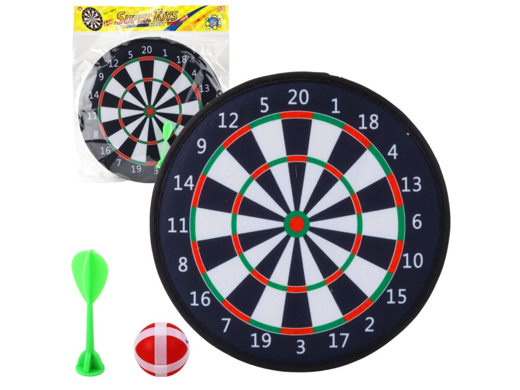 - Sada obsahuje černou terč o průměru 28 cm, jednu šipku a jeden míček, oboje zakončené suchým zipem
