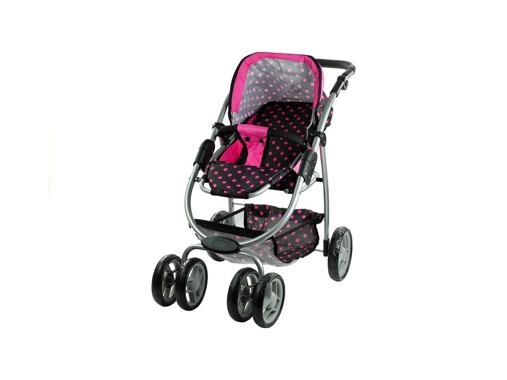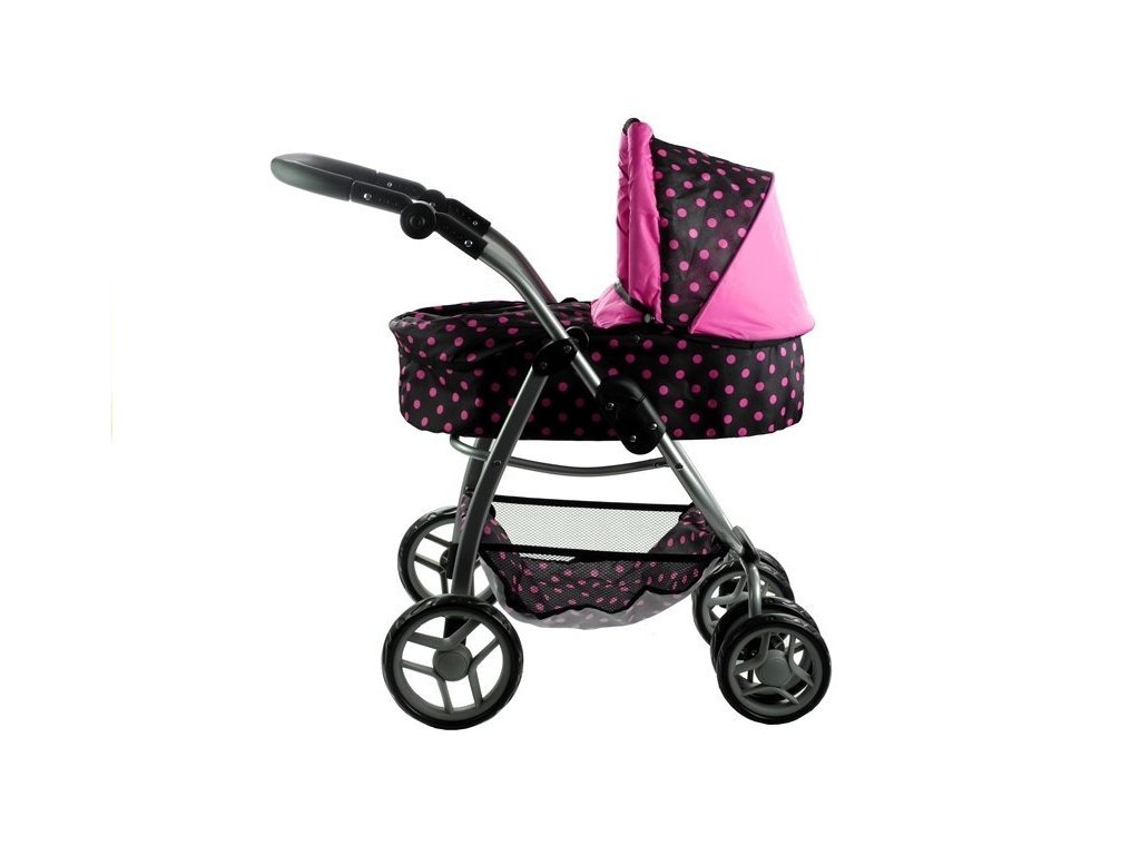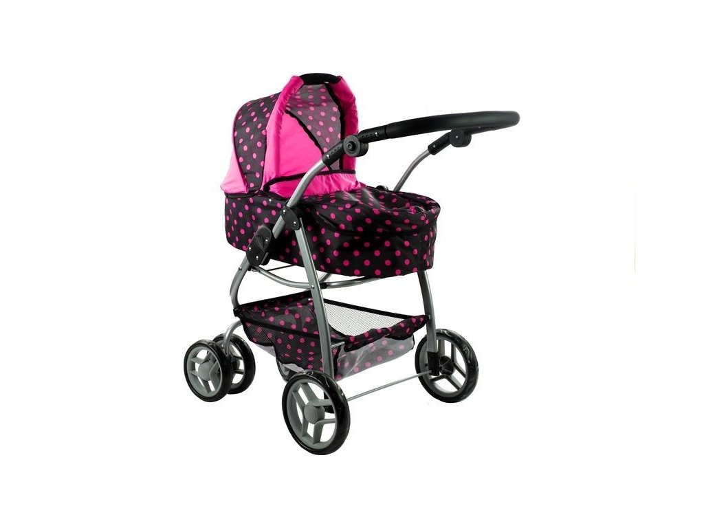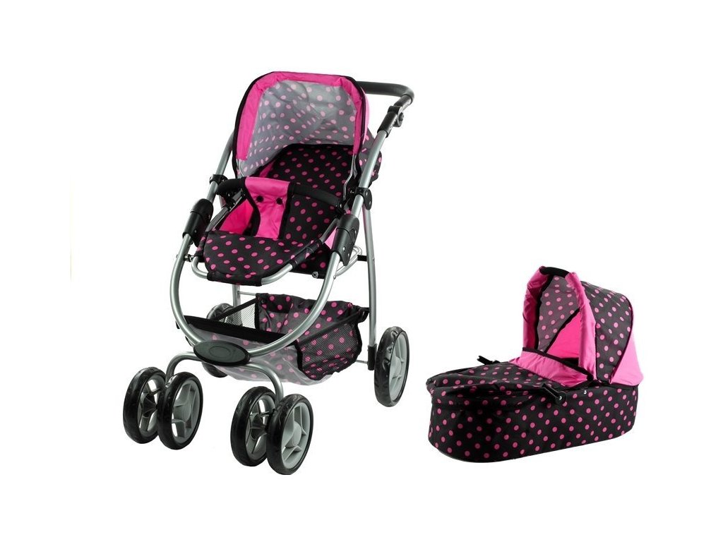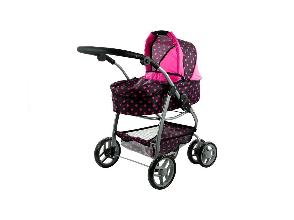 Multifunkční kočárek pro panenky Alice černý s růžovými puntíky Velká část několik let starých holčiček miluje kočárky, které jim umožňují hrát si na své milující a starostlivé maminky