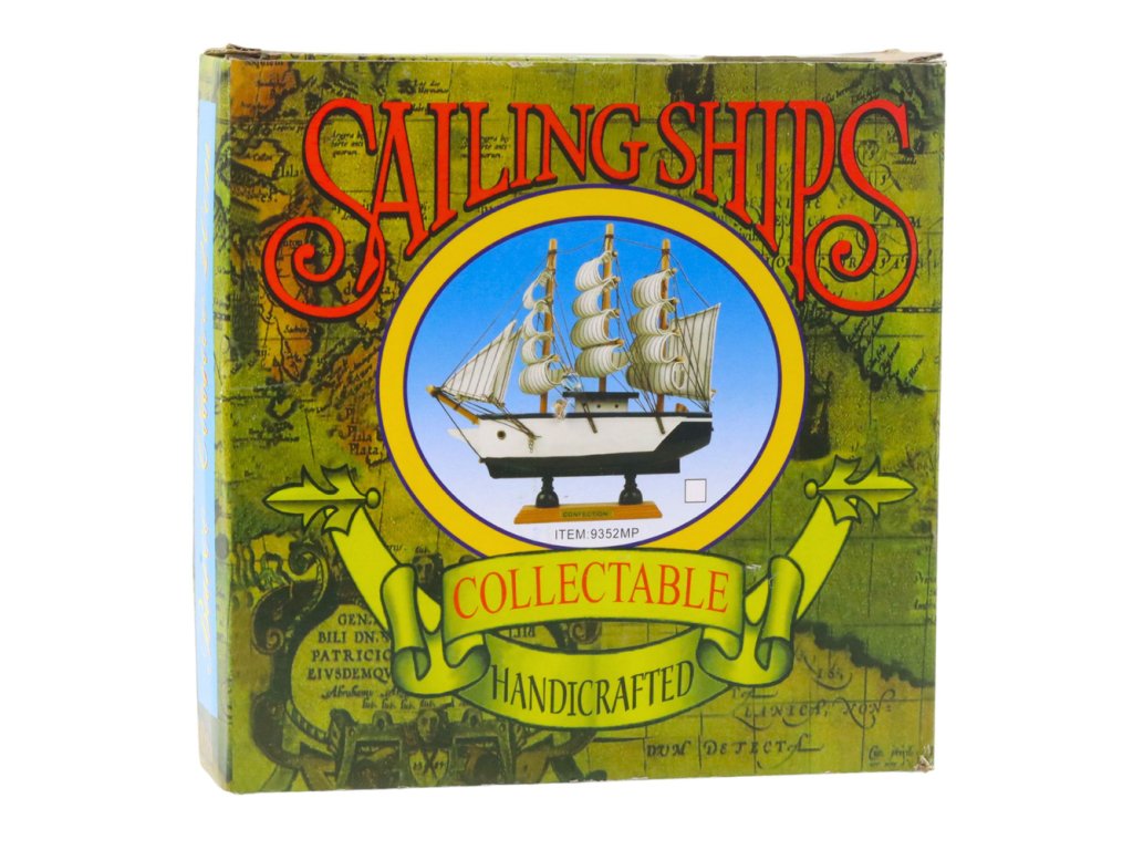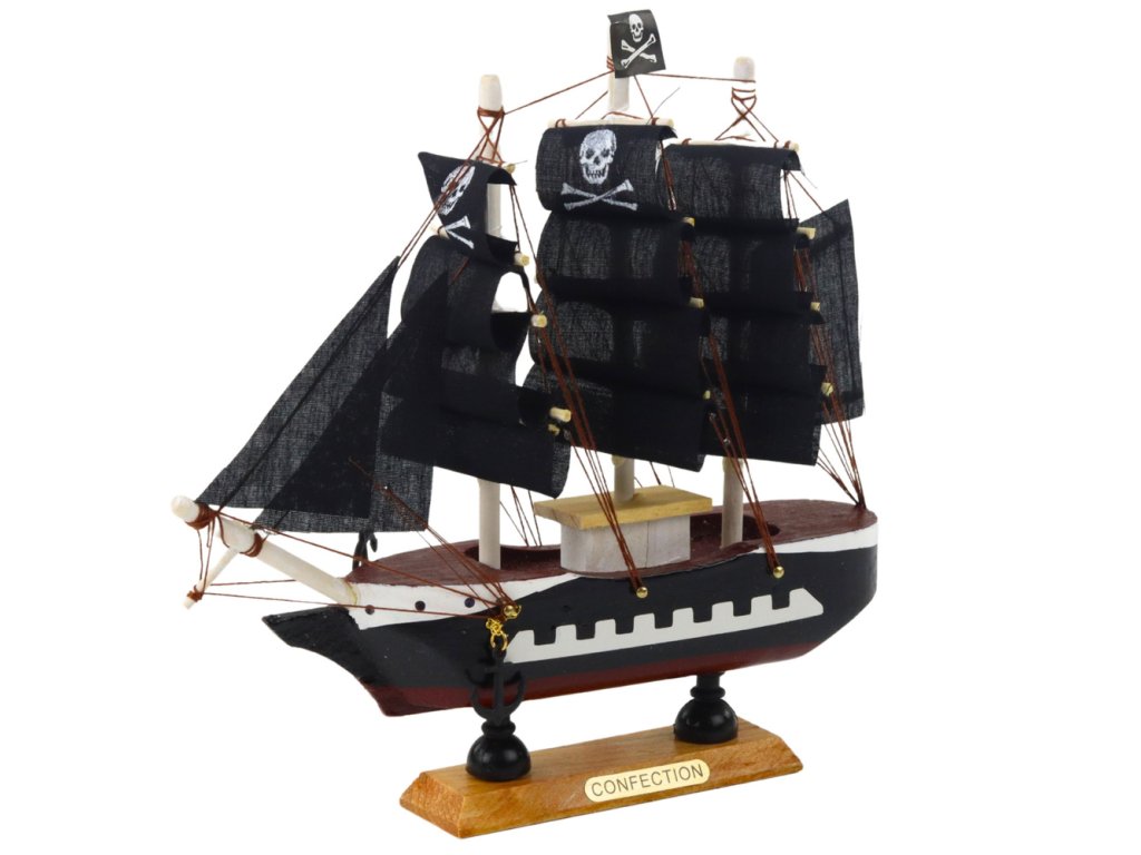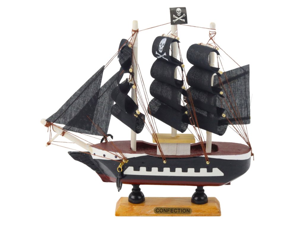 MODEL PIRÁTSKÉ LOĎKY SBĚRATELSKÁ MINIATURNÍ REPLIKA Miniaturní model pirátské plachetnice s černými plachtami a vlajkou s motivem lebky je jedinečný dekorativní prvek pro nadšence do námořní tematiky