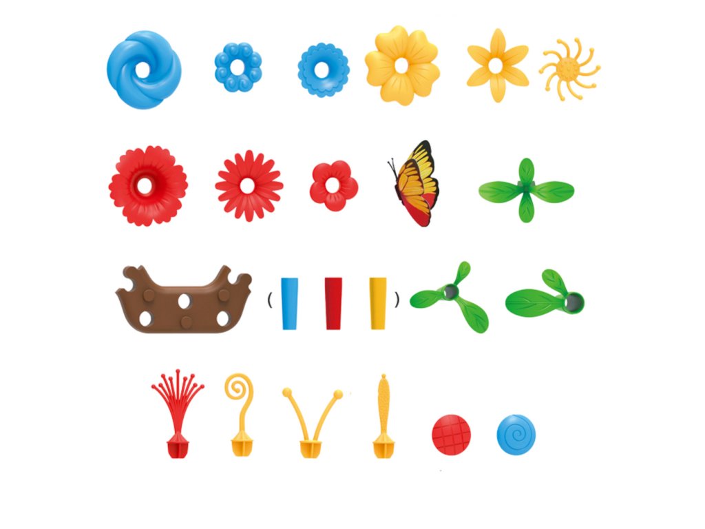 - Hračka rozvíjí kreativitu, manuální dovednosti a koordinaci ruka-oko, zatímco děti učí rozpoznávat barvy a tvary různých typů květin