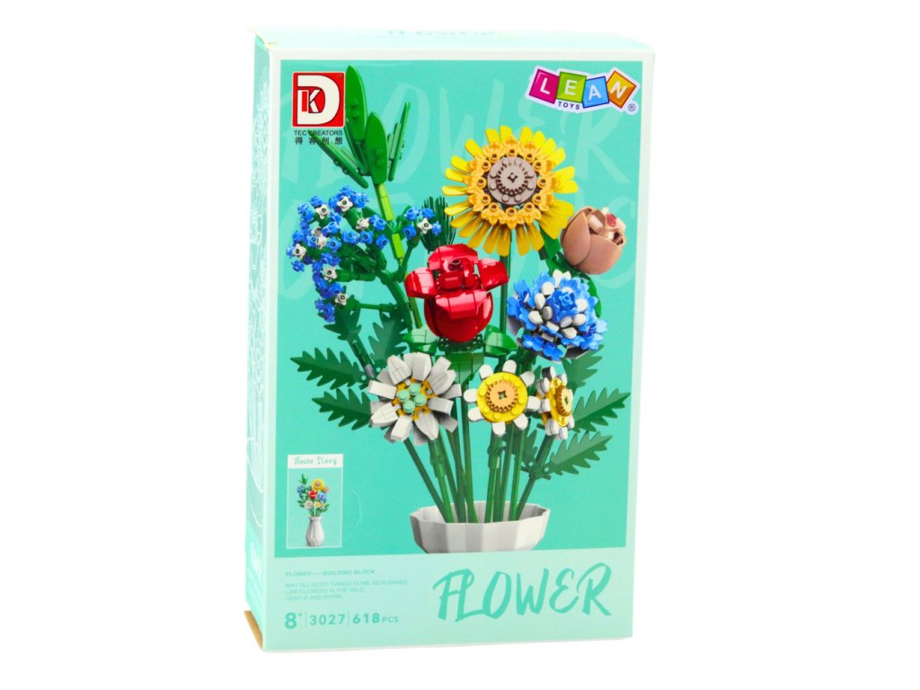 - Sada obsahuje až 618 prvků, z nichž lze postavit okázalou kytici složenou z 11 různorodých rostlin a 4 dekorativních listů