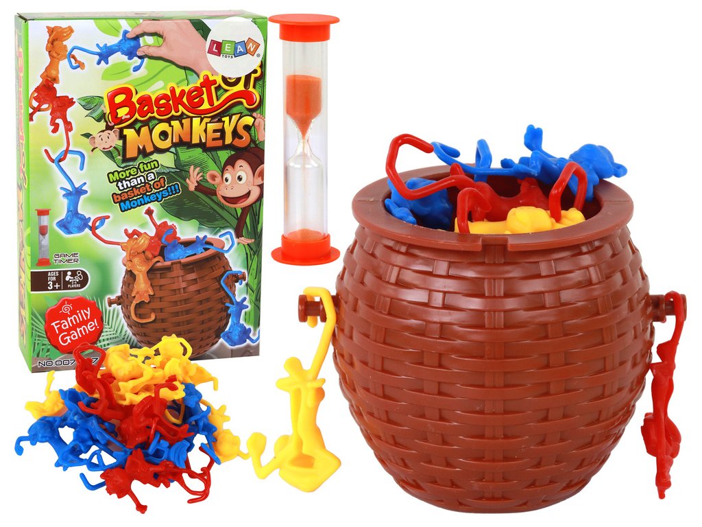 Košík opiček Padající opičky Hra dovedností je zábavná a poutavá hra, která osloví všechny malé dobrodruhy! Pravidla hry jsou nesmírně jednoduchá. Ze všech opiček vytvoříme hromádku a otočíme přesýpací hodiny. První hráč si vezme jednu opičku a snaží se, aniž by se dotkl jiných, vytvořit co nejdelší řetěz. Čas pro skládání řetězu určují přesýpací hodiny. Po uplynutí času se spočítají opičky a zábavu přebírá další hráč. Vyhrává hráč, který složí nejdelší řetěz opiček.