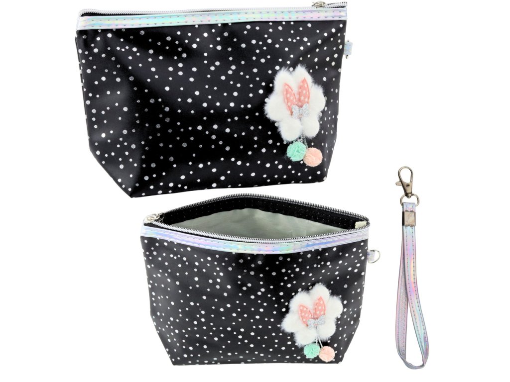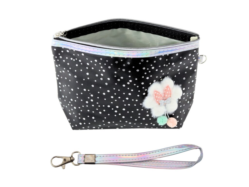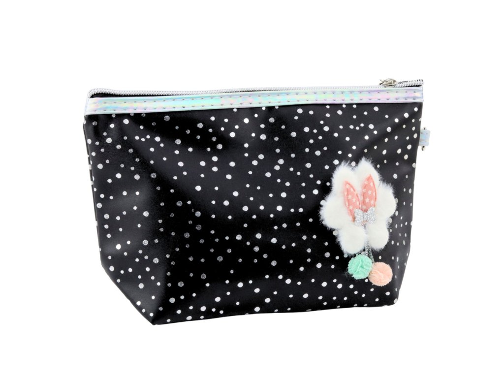 Černá lesklá kosmetická taštička s ozdobným pomponem a motivem mašličky je stylovým a funkčním doplňkem pro každodenní použití nebo do školy.