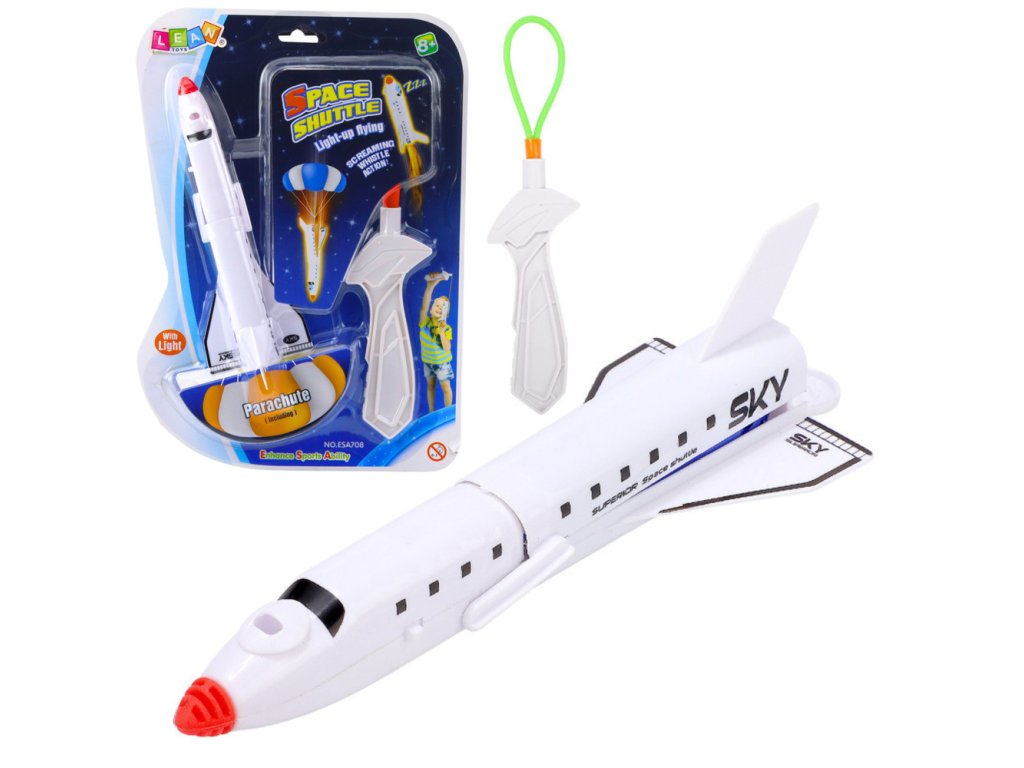 Kosmická loď s padákem a prakem je dynamická hračka určená pro děti, které milují pohyb, experimenty a kosmické motivy Díky vystřelovači ve formě praku děti mohou vypustit raketu do vzduchu a sledovat, jak z velké výšky klesá na zem s rozvinutým padákem