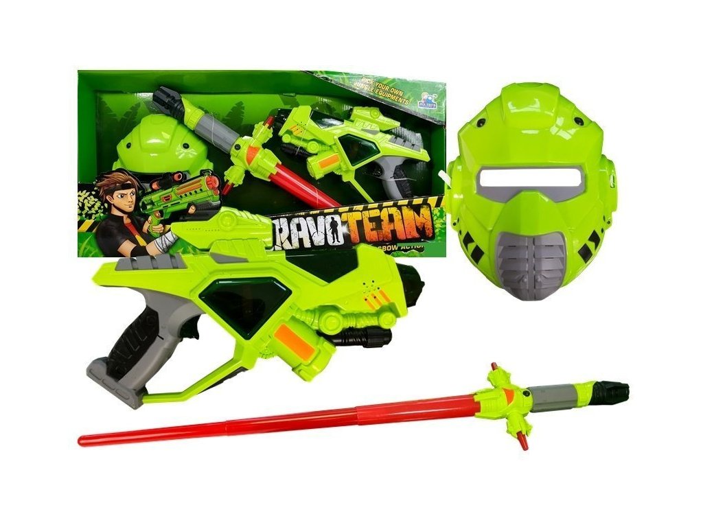 Kosmický bojechtivý nástroj se skládá z pistole a teleskopického meče. Barevná kombinace těchto prostředků obrany se skládá ze světlých barev. Maska, která je součástí sady, je navržena ve zelenošedé barevné kombinaci a má obdélníkový otvor pro oči, dírky v okolí úst a zadní gumičku, která zaručí, že maska při hře zůstane na svém místě. Světelný meč se aktivuje stisknutím tlačítka v jeho středové části a jeho rozložení je velmi jednoduché – stačí s ním zatřást dopředu a pomůže v boji zvítězit. Pistole při stisknutí spouště také svítí a vydává zvuky, takže je vhodné vyzkoušet hračku ve tmavém prostředí.