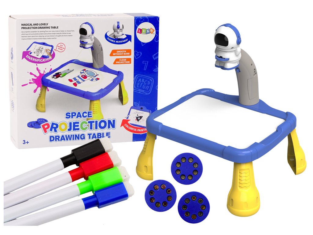 Kosmický projektor na kreslení Tabule Stoliczek Kosmos Sada projektoru s motivem vesmíru pro děti na kreslení je kreativní hračka, která povzbuzuje děti k tvořivosti a objevování tajemství vesmíru Sada se skládá z barevného stolku a projektoru ve tvaru kosmonauta