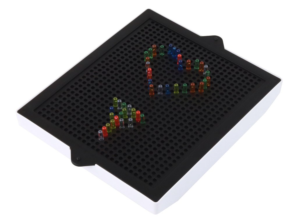 Tato černá deska ve tvaru monitoru s otvory se stává polem pro vyjádření vaší kreativity Sada obsahuje barevné špendlíky, které můžete umisťovat podle vlastního nápadu a vytvářet tak trojrozměrné vzory a světelné efekty