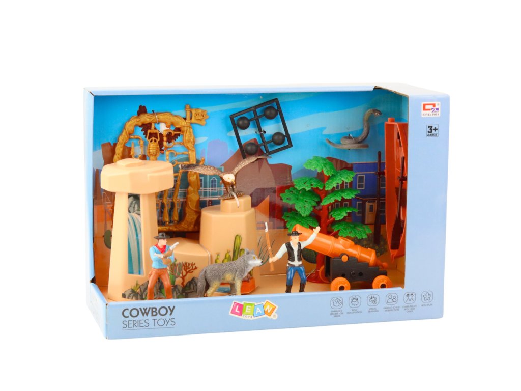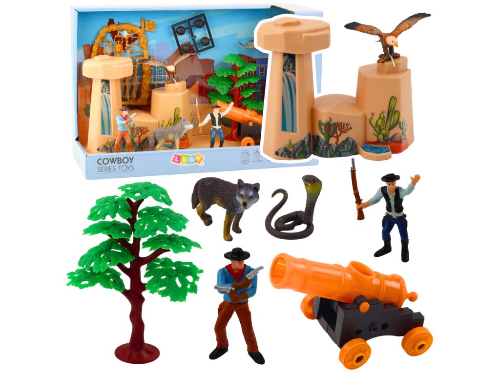 Součástí sady jsou podrobně zpracované figurky kovbojů, realistická divoká zvířata, prvky krajiny a bohatá sada doplňků, které dítě přenesou do atmosféry Divokého Západu Každý prvek sady je vyroben z pevného, odolného plastu, který je odolný vůči intenzivnímu používání