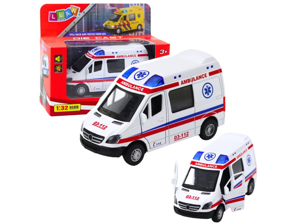 Vstupte do světa záchranných operací s touto úžasnou karetkou ambulans v měřítku 1:32 Tento kovový model s napěťovým pohonem pull back vám přináší autenticitu skutečného záchranného vozidla