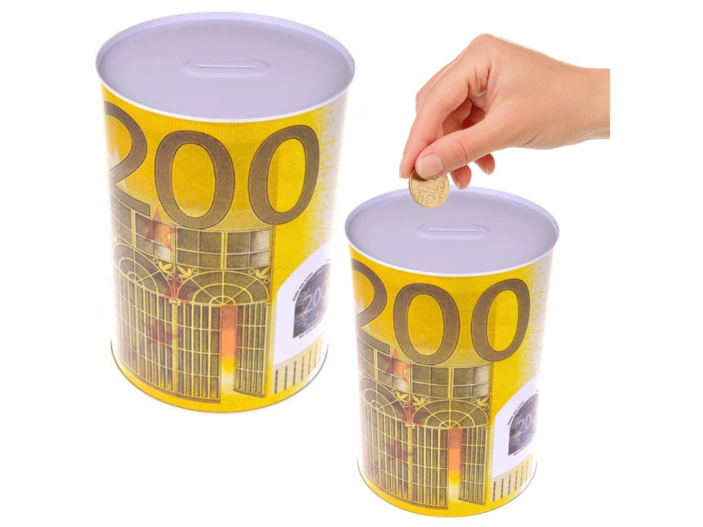 - 16,5 x 12 cm je efektní kovová pokladnička ve formě plechovky s potiskem bankovky 200 euro a mincí