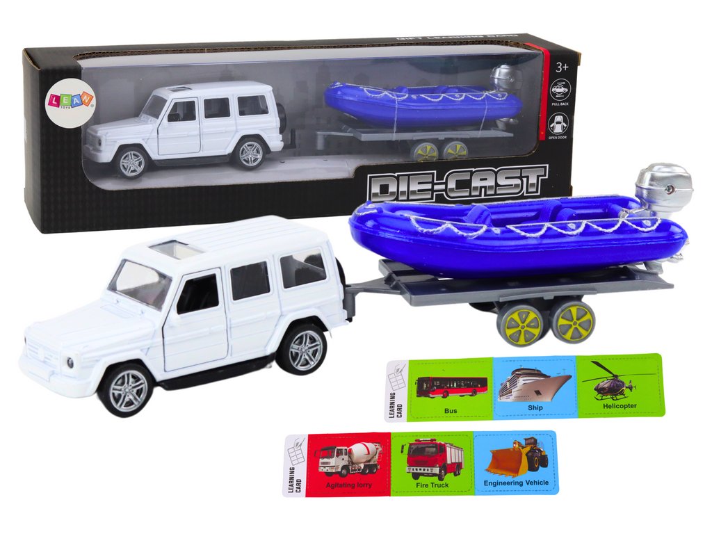 Terénní auto s přívěsem a motorovým člunem je ideální hračka pro malé dobrodruhy, které spojuje eleganci s funkčností Bílé terénní auto je vyrobeno z kovu, což zajišťuje jeho pevnost a trvanlivost