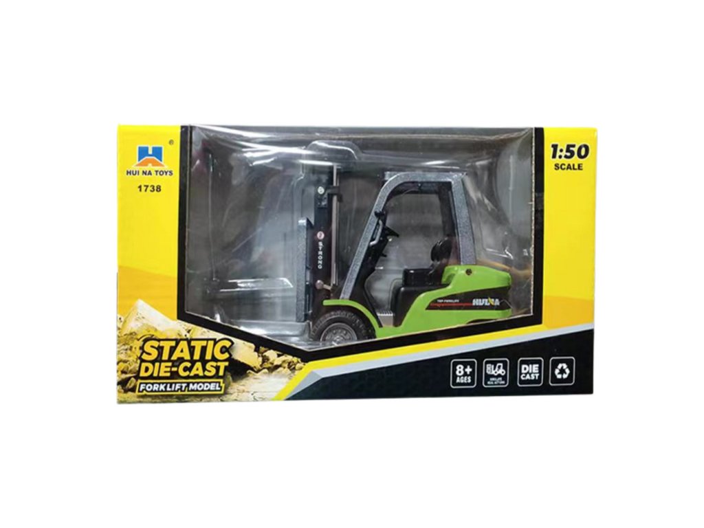 - Kovový model vysokozdvižného vozíku Huina Zelený 1:50 je precizně vyrobená miniatura, která věrně zobrazuje skutečné skladové vozidlo