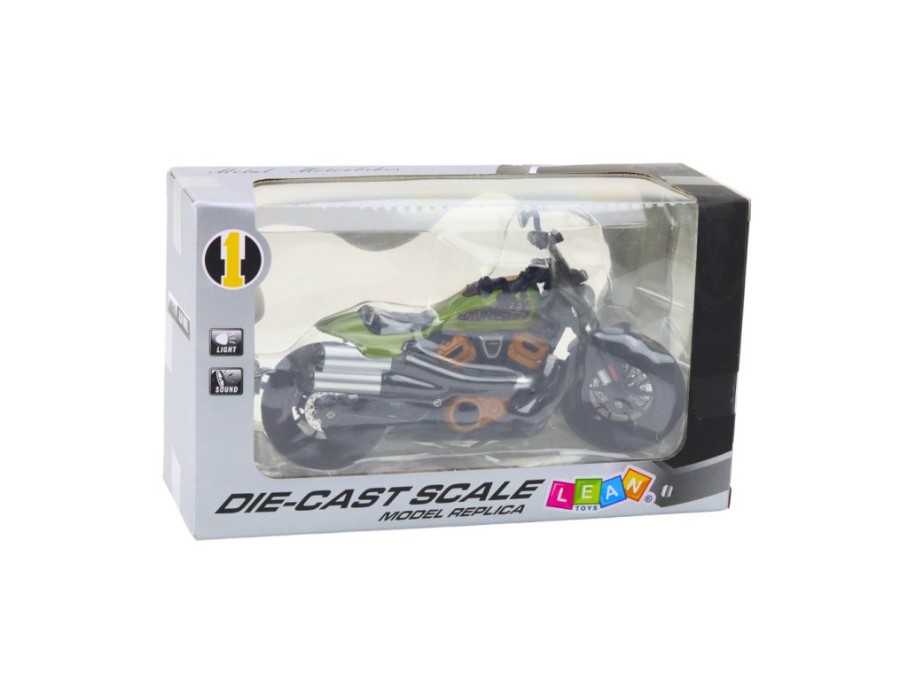 - Obohaťte svou sbírku či interiér tímto nádherným kovovým modelem motocyklu Chopper 1:12 v černé barvě se zelenými prvky
