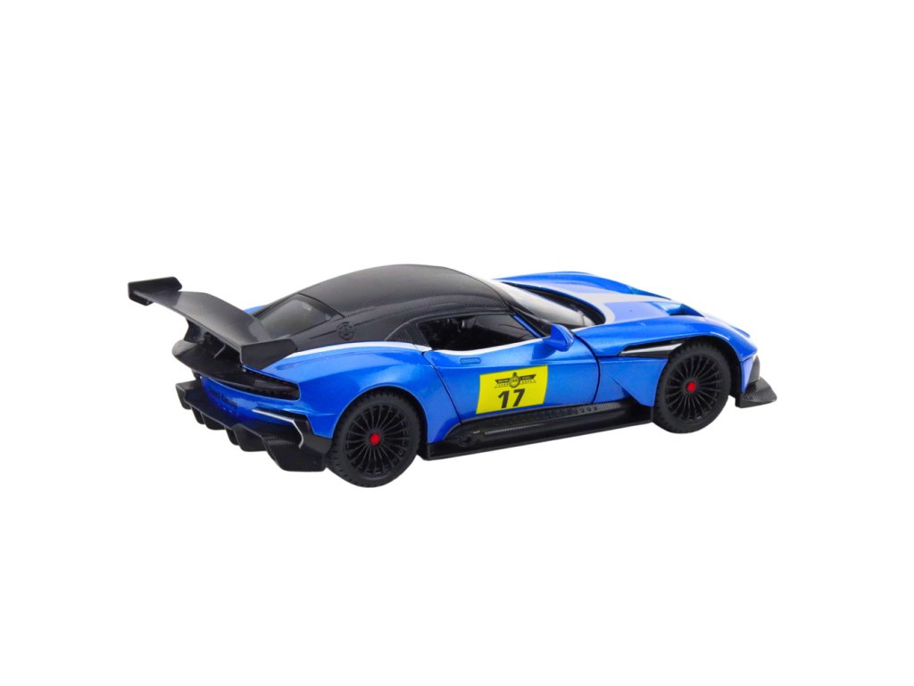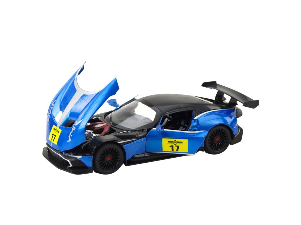 Kovové Sportovní Auto 1:22 Světla Zvuky Náhon Modré je perfektní volba pro děti a sběratele, kteří oceňují realistické provedení, dynamický vzhled a působivou zábavu Karoserie modelu je vyrobena z kovu, což zajišťuje jeho trvanlivost, odolnost vůči poškození a estetický, robustní vzhled připomínající skutečné závodní automobily