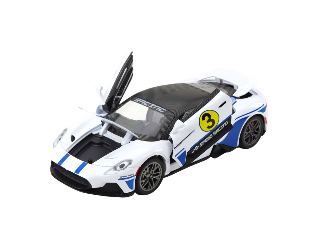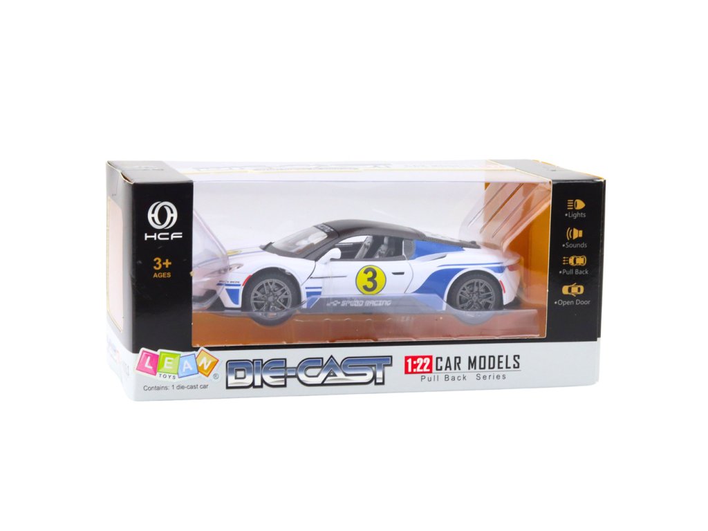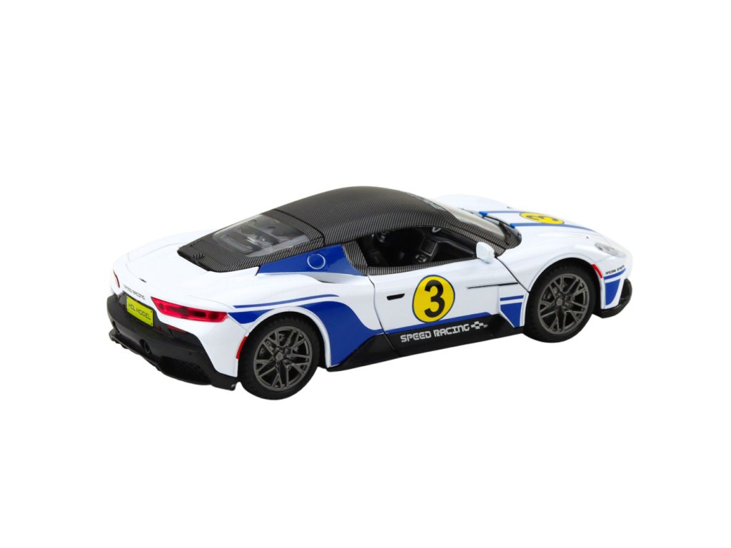 Kovové sportovní auto 1:22 světla zvuky pohon bílý Sportovní auto v měřítku 1:22 je ideální volbou pro děti i sběratele, kteří si cení realistického provedení, dynamického vzhledu a efektní zábavy Karoserie modelu je vyrobena z kovu, což zaručuje jeho odolnost, ochranu před poškozením a estetický, solidní vzhled připomínající skutečná závodní auta