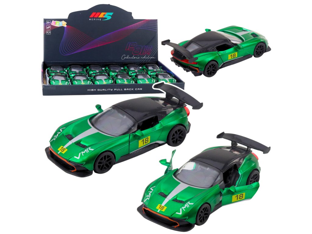 Kovový sportovní závodní vůz 1:32, zelený s otevíracími dveřmi a pull-back mechanismem