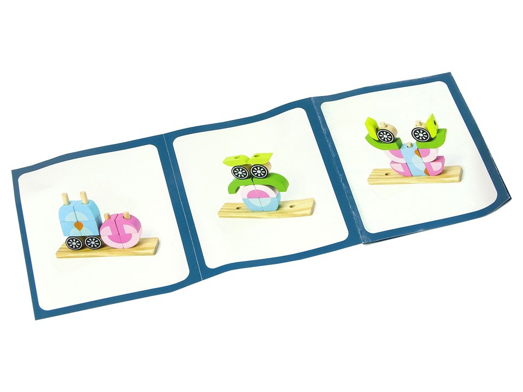 Kostky ve tvaru sovy se skládají z podstavce s tyčkami a 12 kostek Ze všech prvků lze sestavit různá zvířata nebo předměty