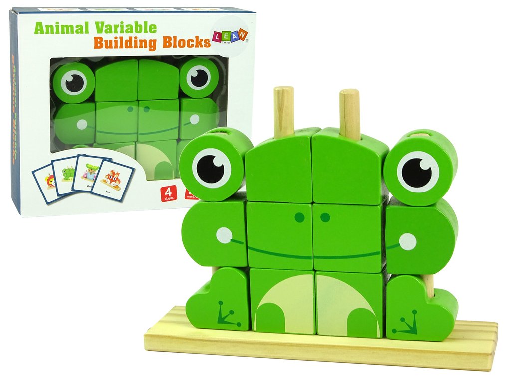 Kostky ve tvaru žabky se skládají z podstavce s tyčkami a 12 kostek Ze všech prvků lze sestavit různá zvířata nebo předměty
