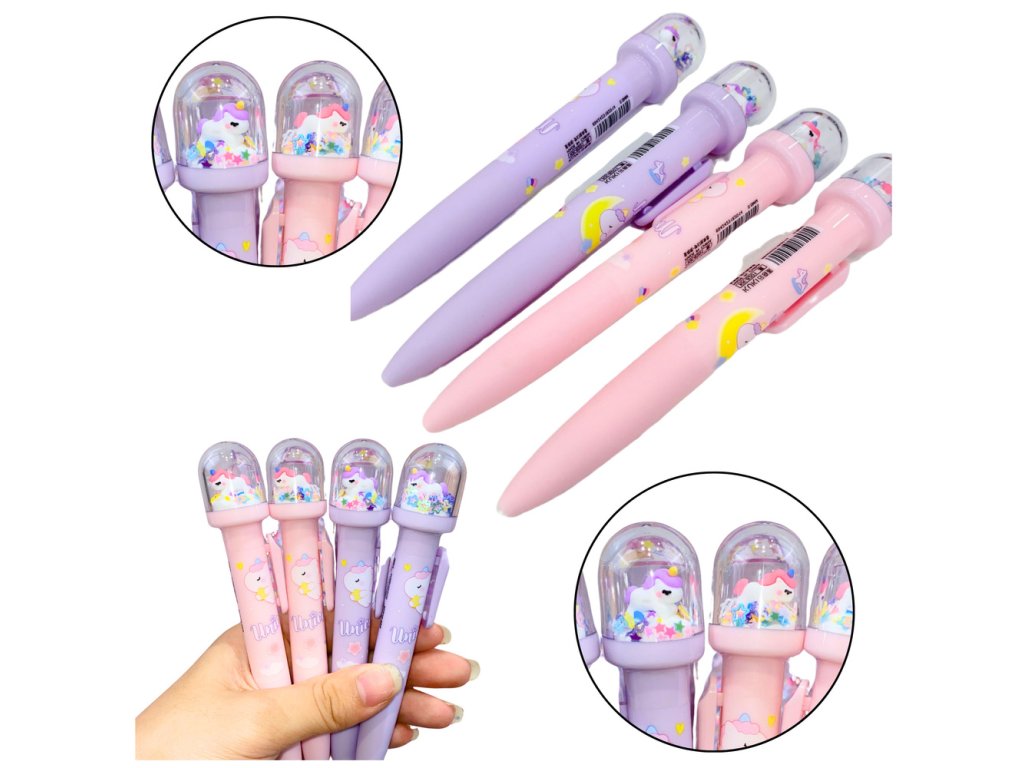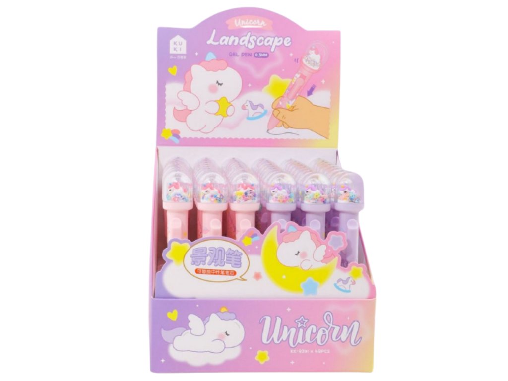 Propiskou s kopulí a třpytkami Jednorožec je okouzlující psací nástroj, který je ideálním doplňkem školní výbavy pro děti a mládež Pastelové barvy, pohádkové motivy a průhledná kupole s pohyblivými prvky přinášejí radost z psaní