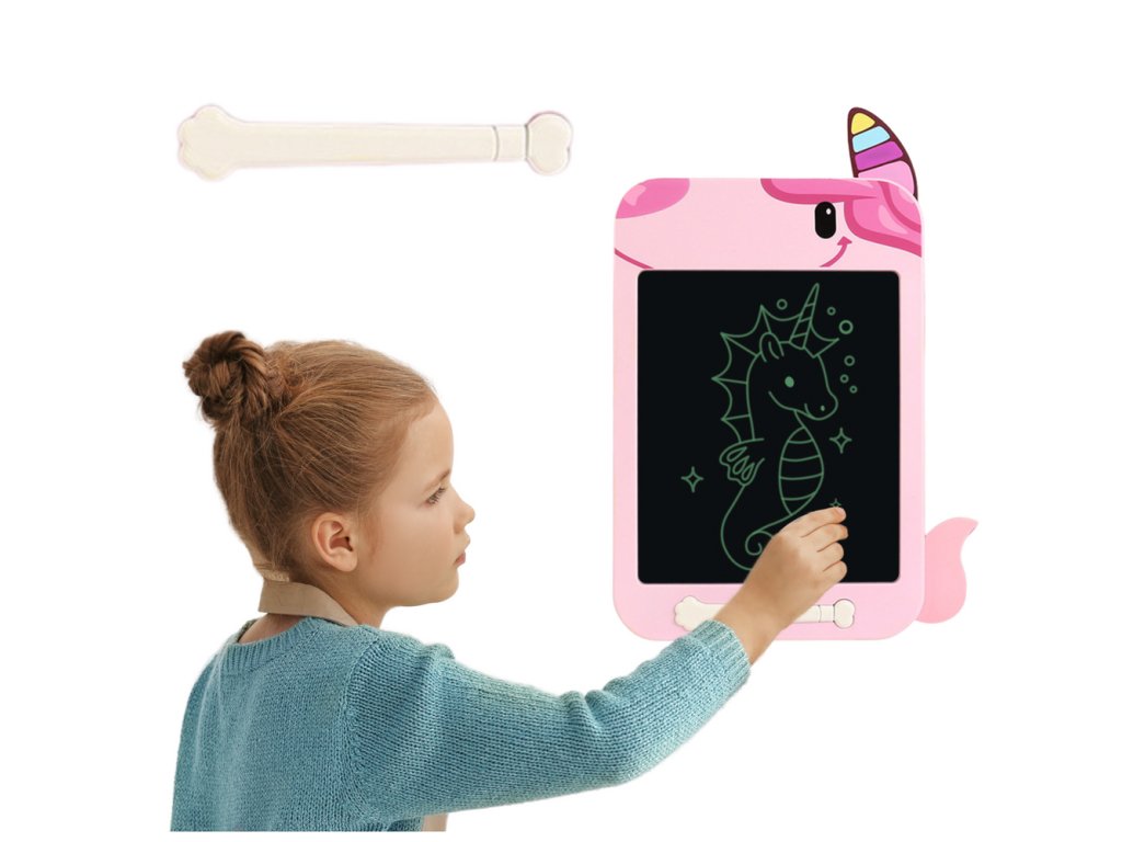 LCD psací a kreslící tabule ve tvaru růžového jednorožce je výjimečná vzdělávací a kreativní hračka, která rozvíjí představivost, manuální dovednosti a soustředění dítěte Díky moderní a citlivé LCD obrazovce může malý umělec pohodlně kreslit, psát a vytvářet barevné náčrty bez potřeby papíru, pastelek nebo fixů