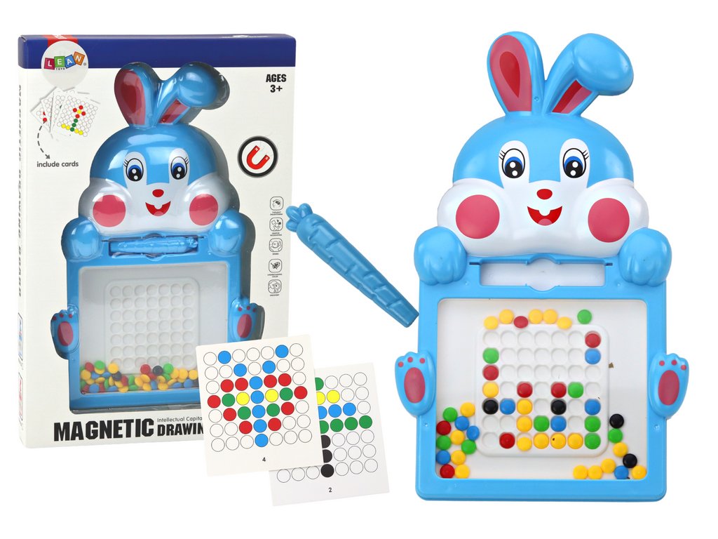 Magnetická tabule ve tvaru roztomilého modrého zajíce není jen obyčejná hračka – je to magický zdroj inspirace a rozvoje pro vaše dítě. Tato výjimečná magnetická tabule nabízí neomezené pole pro vyjádření malých umělců. Sada obsahuje barevné kuličky v odstínech červené, žluté, zelené, modré a černé, které podněcují ke tvorbě fantastických obrázků a vzorů. Speciální magnetické pero umožňuje dětem volně manipulovat s kuličkami, což rozvíjí přesnost pohybů a manuální dovednosti.