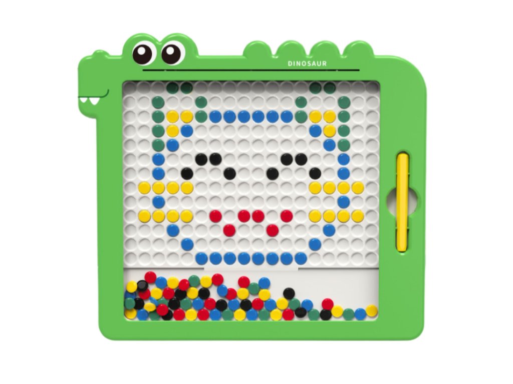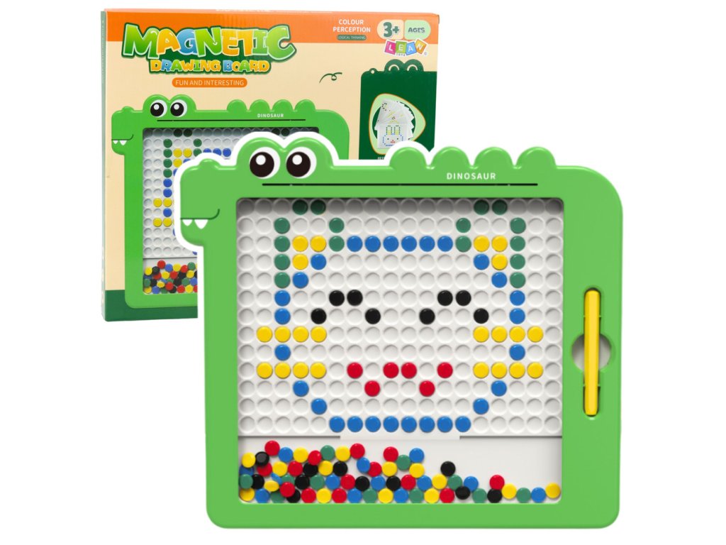 Magnetická tabule Dino Skládačka je unikátní vzdělávací hračka, která spojuje učení s kreativní zábavou Díky inovativnímu systému barevných disků a magnetického pera může dítě vytvářet různé obrázky bez použití papíru, tužek nebo barev