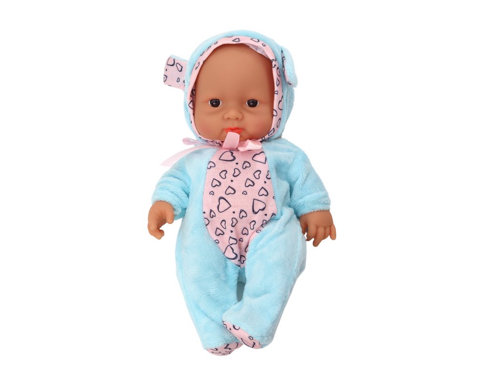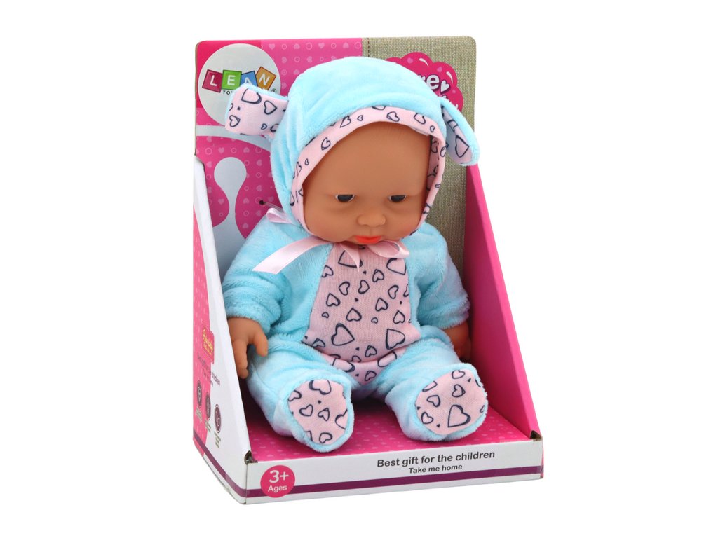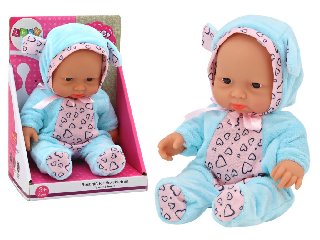 Je oblečená do roztomilých modrých šatiček zdobených srdíčky, které jí dodávají šarm a sladký vzhled Naše panenka má také čepičku s ušima a mašlí, která jí dodává na roztomilosti