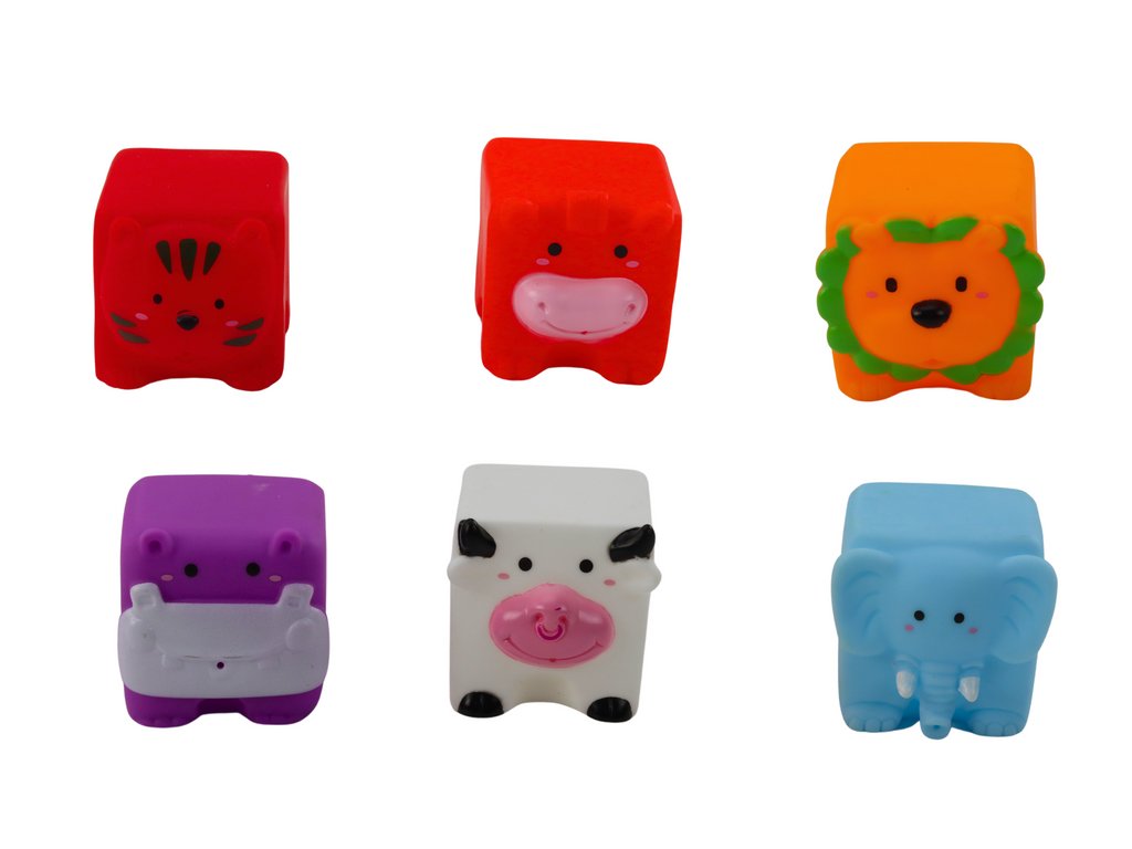 - 6 barevných gumových kostiček ve tvaru zvířat, která nejen baví, ale také učí