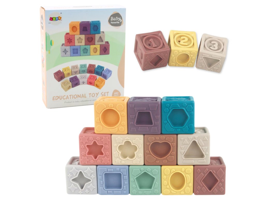 Sada obsahuje 12 kostek, které se liší barvami, tvary a texturou, což stimuluje rozvoj smyslového vnímání a povzbuzuje ke kreativnímu objevování Měkké a příjemné materiály zajišťují, že hra je nejen příjemná, ale také zcela bezpečná pro miminko