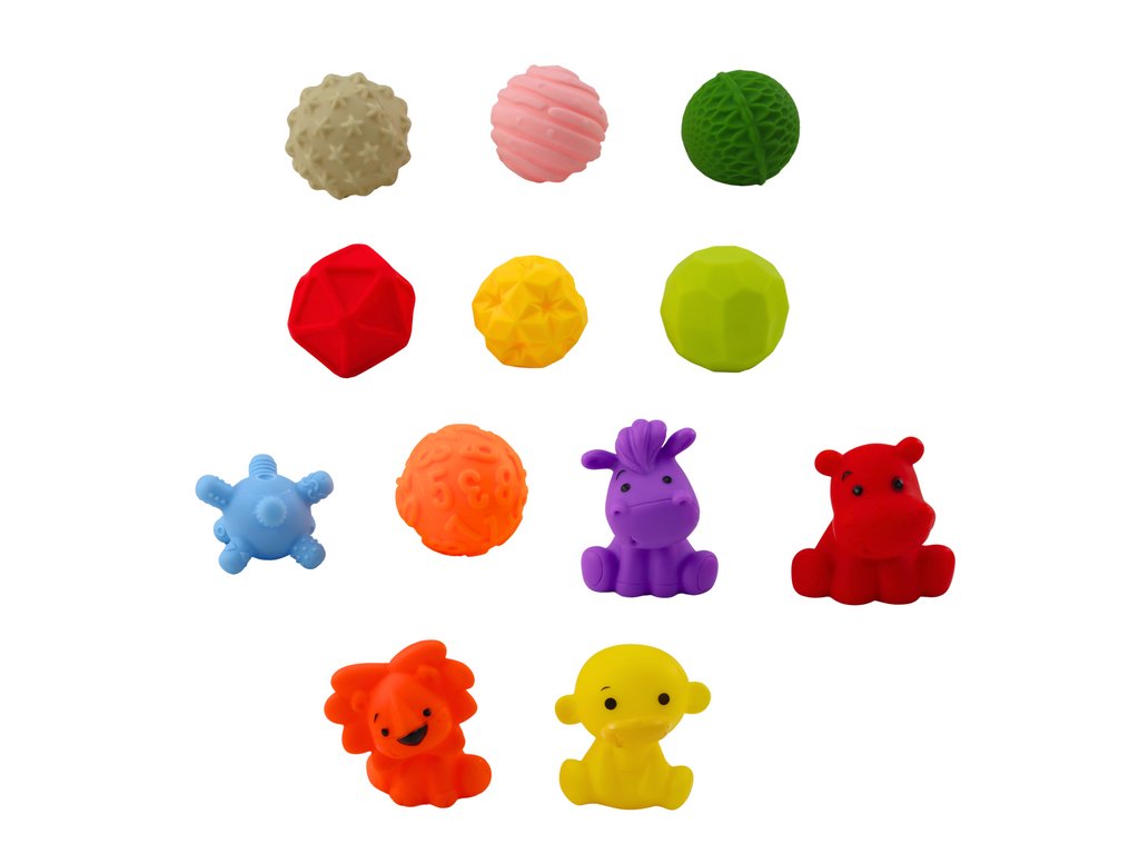 - Sada se skládá z 20 barevných gumových prvků, které nejen upoutají pozornost, ale také zapojí dětský hmat