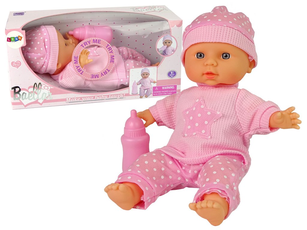 Každá malá holčička sní o panenkách, dokonce sbírá různé druhy. Hra s panenkou rozvíjí dětskou představivost, motoriku a manuální zručnosti. Holčička se stává zodpovědnější a emocionálnější, když pečuje o svého sladkého miminka. Péče o panenku má vzdělávací rozměr, který se v budoucnu zúročí. Panenka je oblečená v růžové pyžamko s puntíky. Na hlavě miminka je roztomilá čepička. Celek do sebe dokonale zapadá. Po stisknutí na trupu panenky uslyšíme zvuky typické pro malé dítě: pláč, žvatlání, slovo „maminka“ atd. Každé stisknutí překvapí zvuky. Panenka má pohyblivé ruce a nohy, oblečení je snímatelné, což umožní výměnu šatníku. Představená panenka je vyrobena z atestovaných materiálů vysoké kvality, což svědčí o bezpečí při jejím používání i o dlouhé životnosti hračky.