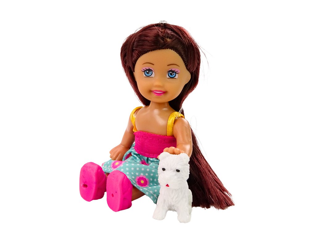 Mini panenka s dlouhými vlasy a barevným oblečkem se zvířátkem je roztomilá a kompaktní hračka, ideální pro dívky, které milují panenky a zvířátka.